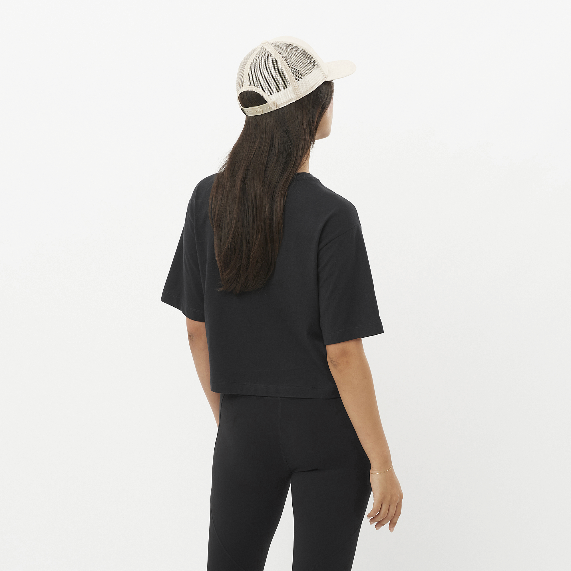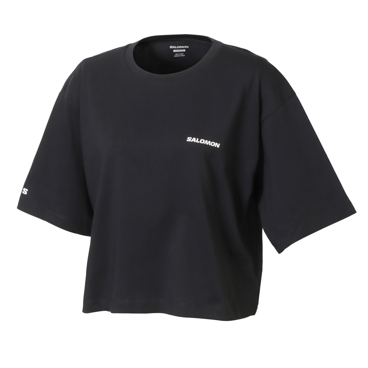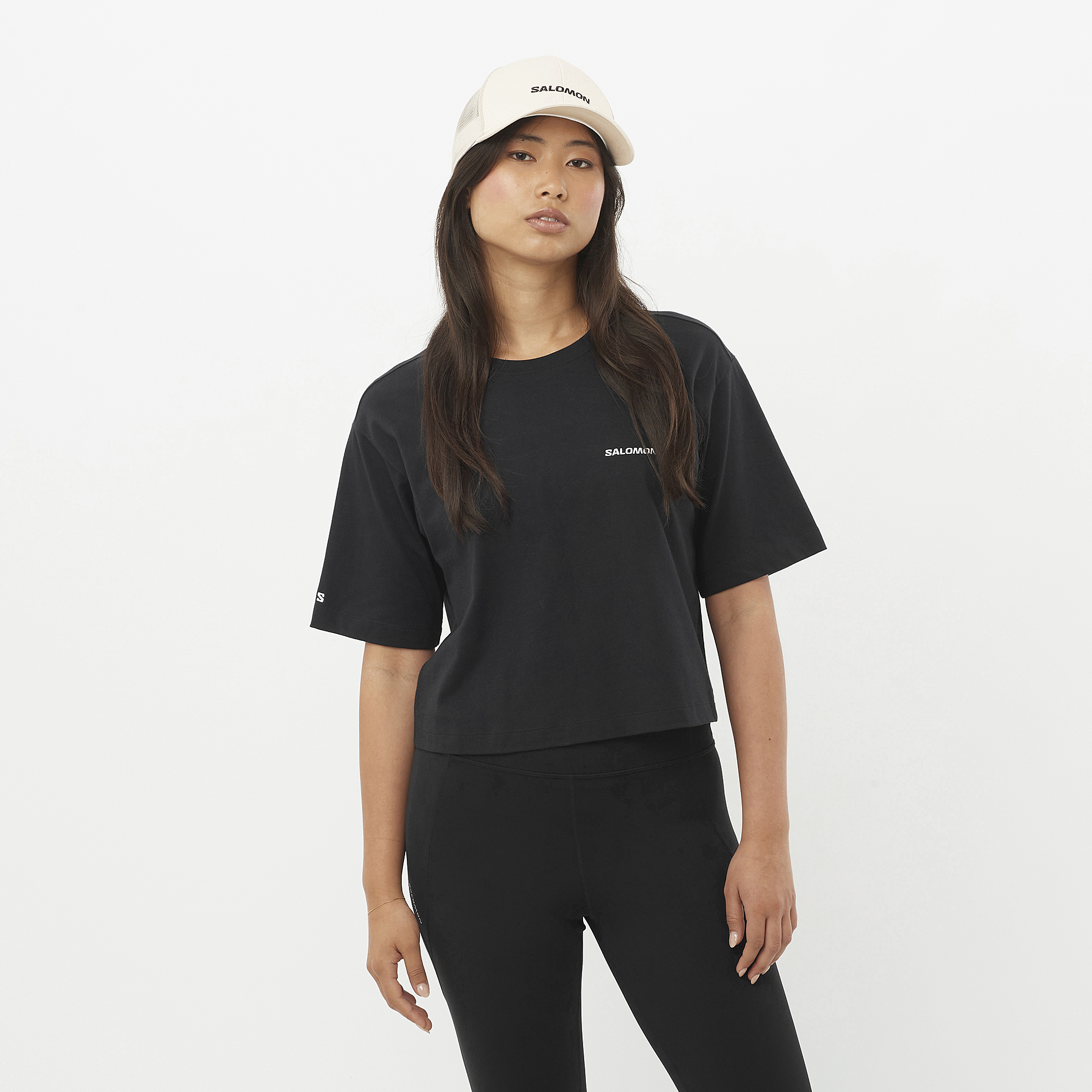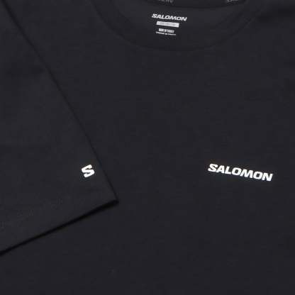 Salomon ロゴを配した、ゆったりしたフィット感の女性用 Salomon Logo クロップド丈 T シャツ。通気性に優れた心地よい肌ざわりの柔らかなオーガニックコットンを使用しています。